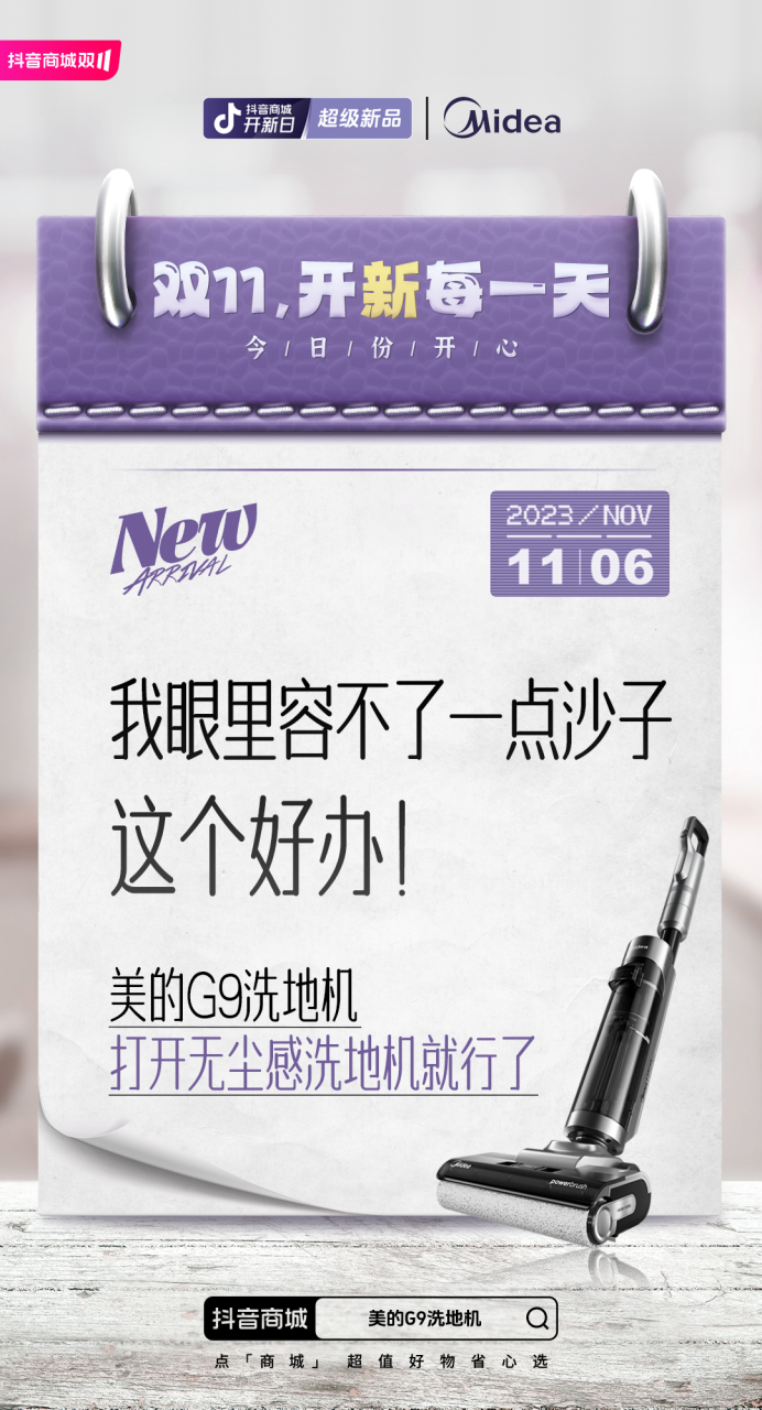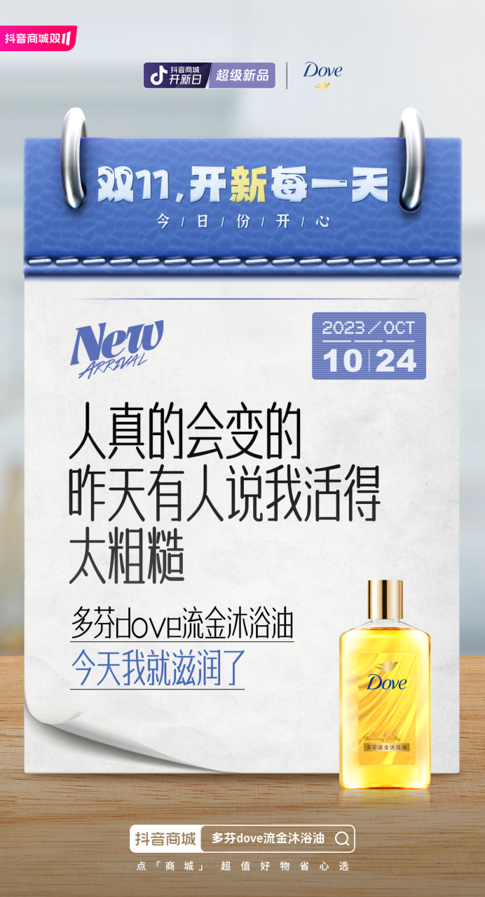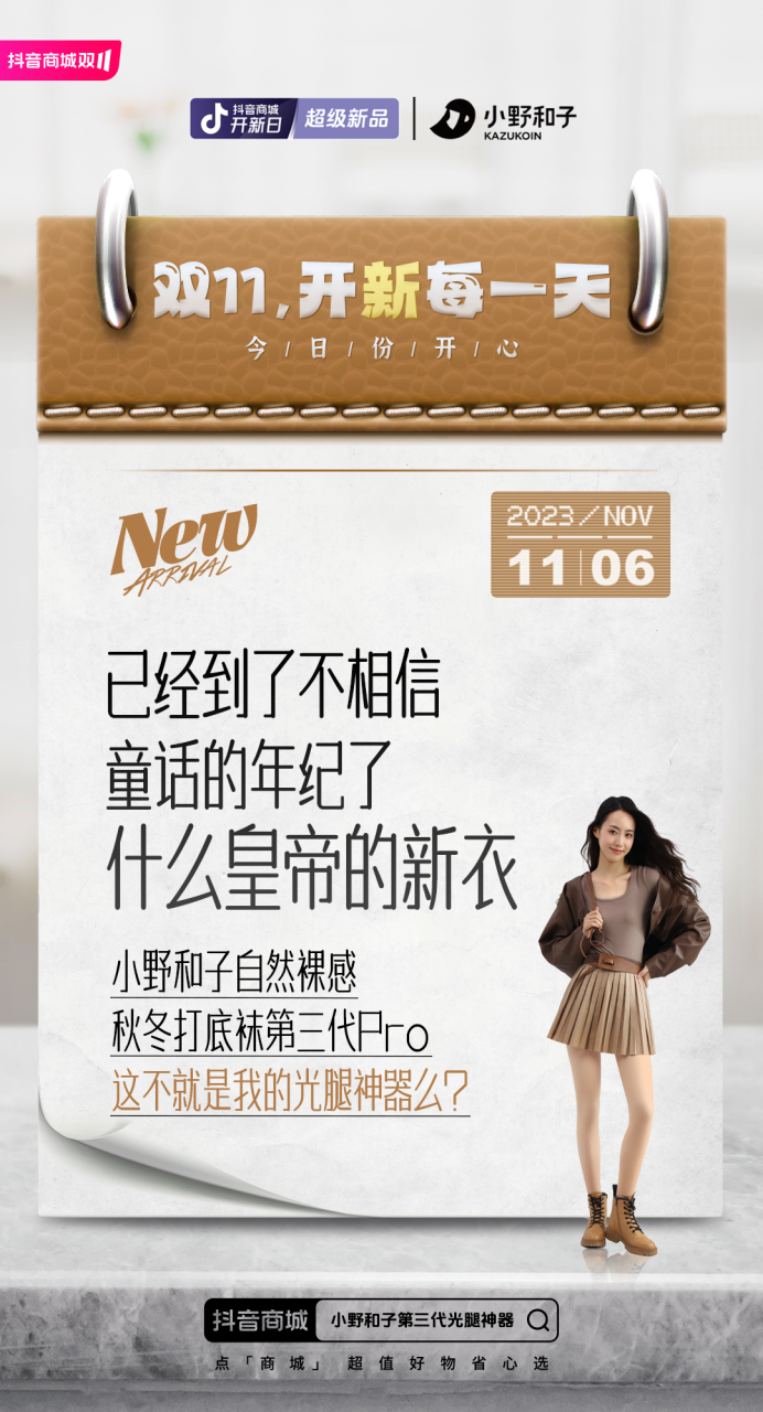 抖音商城开新日超级新品从消费者洞察入手,给出了答案。结合抖音近期正火的“万圣节玩梗式COS”热点趋势,洞察到现在的年轻人,更偏爱用娱乐玩梗的方式消解传播内容的严肃性。于是,在10月23日-11月11日,平台从66+品牌中选出最有梗的34个新品,发布新品海报。每张海报都有一句段子式文案,将新品卖点以内容化创意趣味呈现,汇聚成一本引发全民开心的双11《开新日历》,进一步打造开心的情绪氛围。