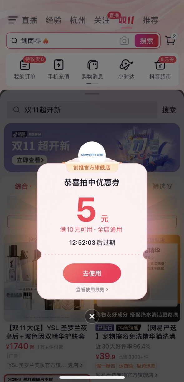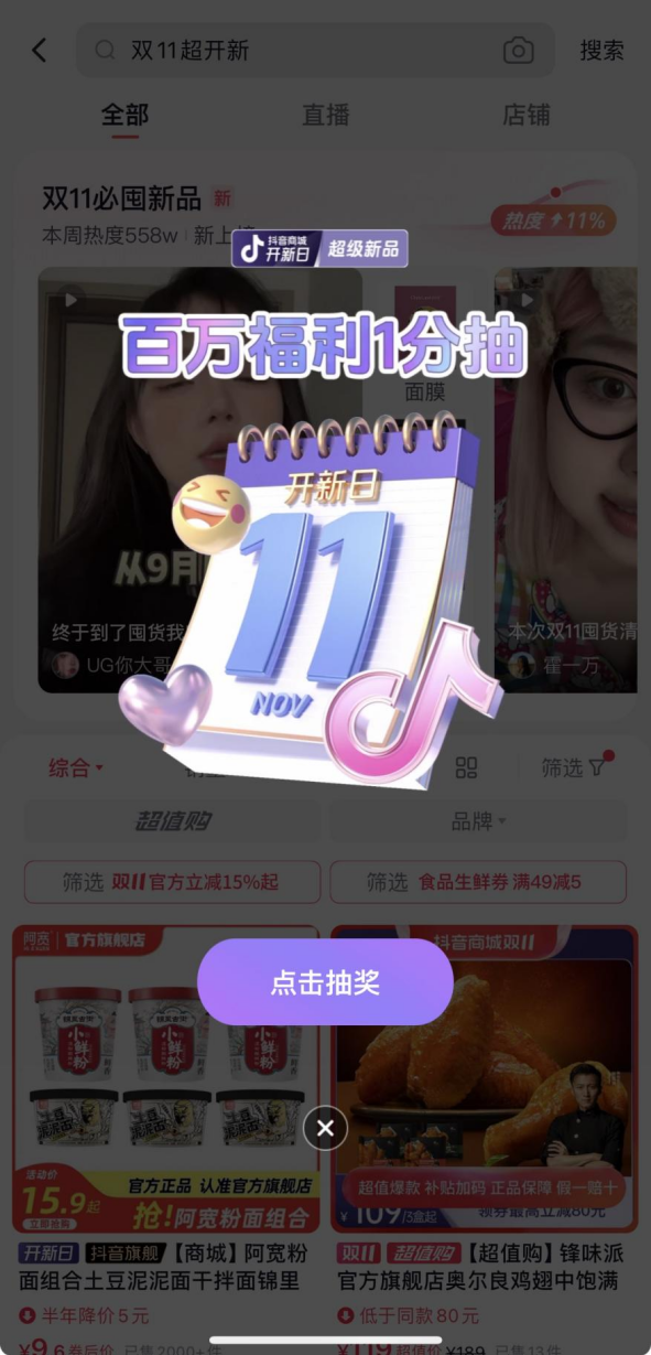 当然,所有的内容场传播,都是为了引流货架场销售转化。在每个传播动作之后,抖音商城开新日超级新品都在引导大家上抖音商城搜“双11超开新”,并设置“百万福利1分抽”的搜索彩蛋做抓手,将传播流量成功转化为新品销量。