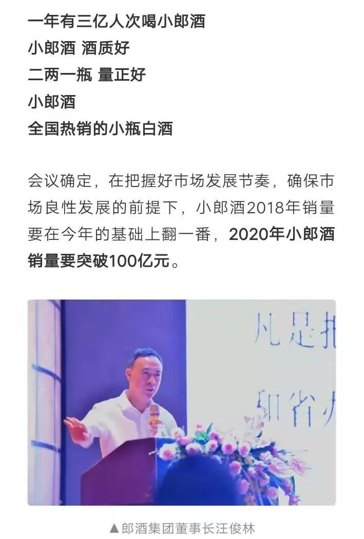 在小瓶酒的品类上,小郎酒销量高于江小白,同时也非常直白地展示了自己的目标:全国热销的小瓶酒。一旦如愿占据小瓶酒的定位,小郎酒降价或者孵化新品牌利用渠道优势与江小白缠斗,对江小白来说都是很危险的。