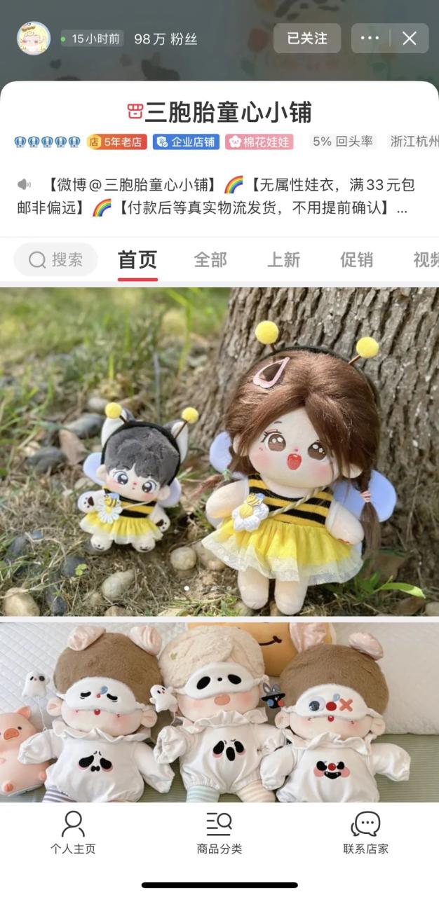 棉花娃娃风起,造就了大量新商家涌入,比起2020年前各种为爱发电的粉丝们自立门户制作裸娃,越来越多标准化的新品牌入圈,但主要还是以中小商家为主。5年老店【三胞胎童心小铺】的微店粉丝量已高达98万,由其他成熟品类的专业跨圈而来的【是胡萝卜呀】,凭借着更专业的产业链资源,快速晋升为无属性商家的原创商家头部,目前微店粉丝数49.4万。