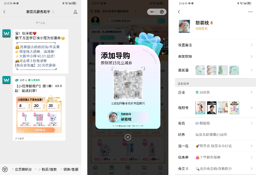 目前,屈臣氏的运营转化,主要通过企微的1对1私聊、客户朋友圈以及社群三个渠道来实现。