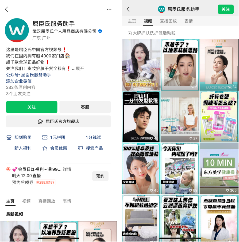 视频号「屈臣氏服务助手」主要内容以品牌宣传、产品介绍为主。主页设置了公众号和企微引流的触点,用户点击链接即可跳转进入私域。