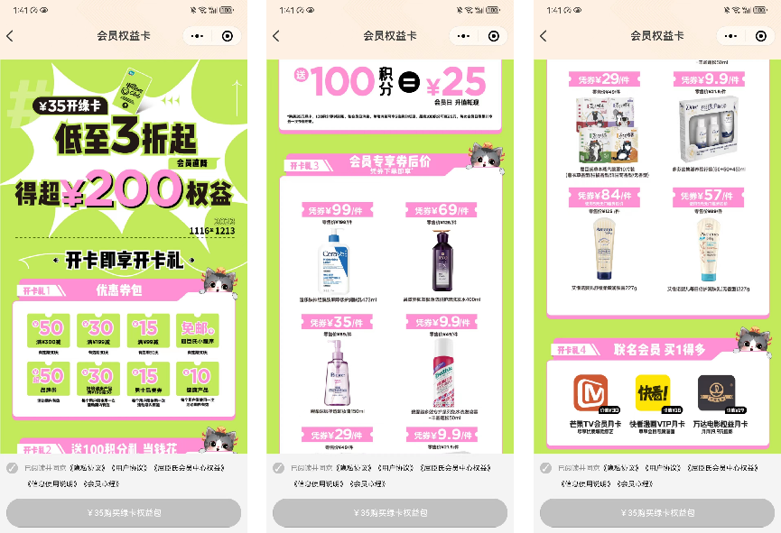 重点说一下它的付费会员,绿卡会员售价35元,包含优惠券包、积分礼、会员专享价、联名会员等4项权益。