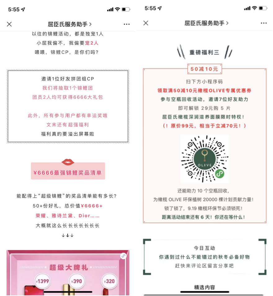 在拥有庞大私域流量的基础之下,屈臣氏会进行一些简单的裂变玩法,合理利用私域资源,实现拉新复购的效果。以公众号裂变和小程序裂变两种方式为例:
