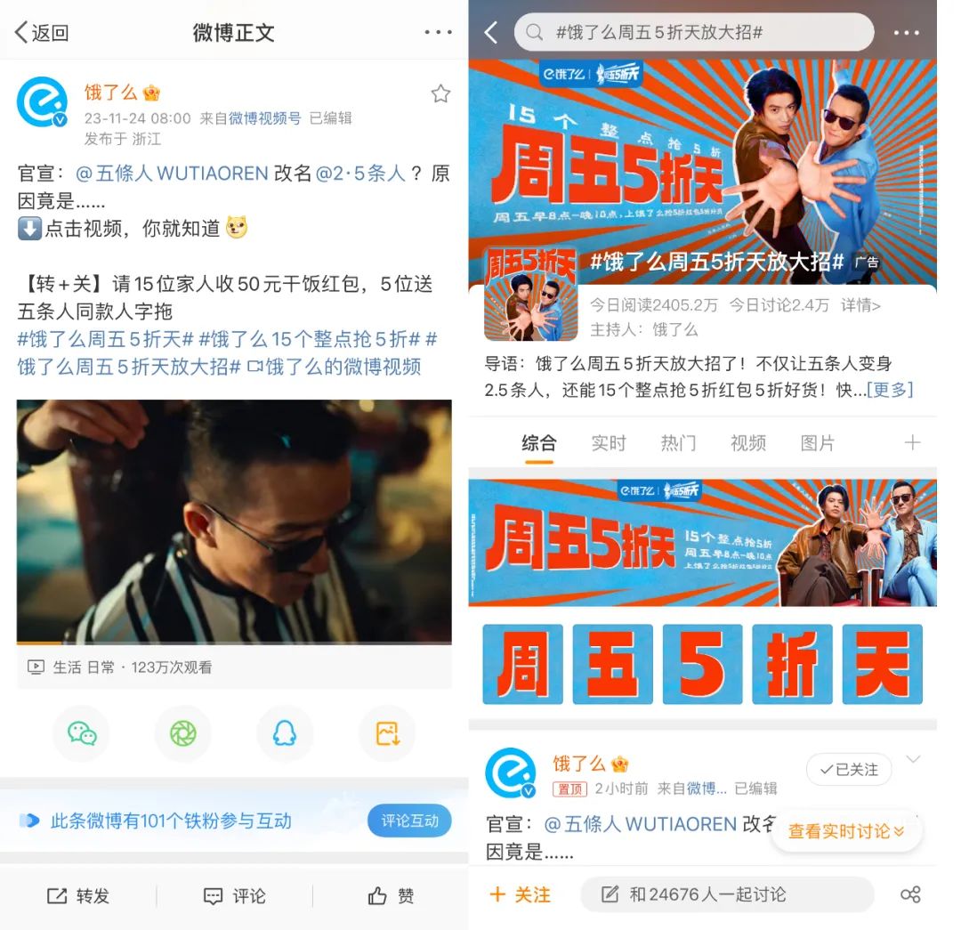 饿了么把「周五5折天」的品牌活动巧妙地转化为「五条人改名2.5条人」的话题事件,给这次传播赋予了娱乐化和接地气的调性。