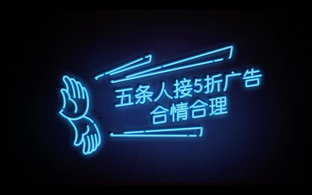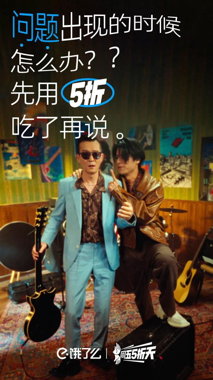 它不仅把五条人的欢乐气质和饿了么打5折的开心氛围对接起来,更是把乐队名字发挥到淋漓尽致。