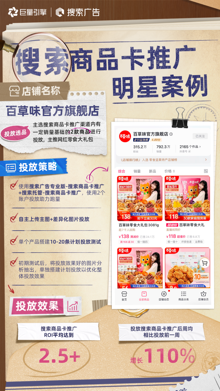 以百草味旗舰店为例,投放搜索商品卡推广后,平均ROI基本稳定在2.5,服饰品牌白小T更是在投放搜索商品卡后,投产直接提升了30%。