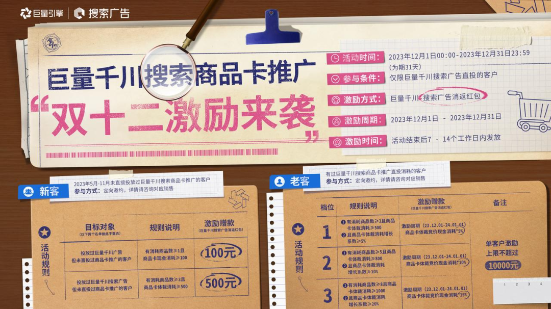12月1日-12月31日期间,搜索商品卡推广将面向新客、老客两个群体,分别推出针对性的福利活动。投放还有返款拿,最高能得10000元消返红包!