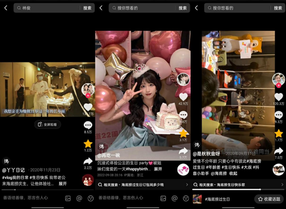例如夫妻博主@丫丫日记 的海底捞生日整蛊,妻子为丈夫庆生亲手抻面,而丈夫安排服务员送玫瑰,欢乐又浪漫;颜值博主@再吃一碗 体验在海底捞过公主式的生日;@是秋秋金呀 则特地穿上了玩偶服对心爱的人表白。在抖音上,#海底捞过生日 话题就有13.6亿次播放。