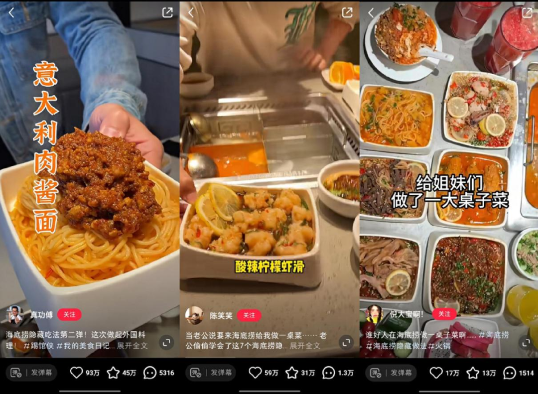还有今年流行的海底捞“隐藏吃法”,美食博主@真功傅 制作了“海底捞隐藏吃法”的系列视频,从中国菜粥底火锅、热干面等到外国菜番茄肉酱面,应有尽有;美食博主@陈笑笑 则记录了丈夫在海底捞制作的七道菜;博主@倪大宝啊!在海底捞制作了捞汁小海鲜、番茄滑蛋牛肉饭等,还附上了食谱。相关话题“海底捞隐藏吃法”在小红书累计有7.2亿浏览。