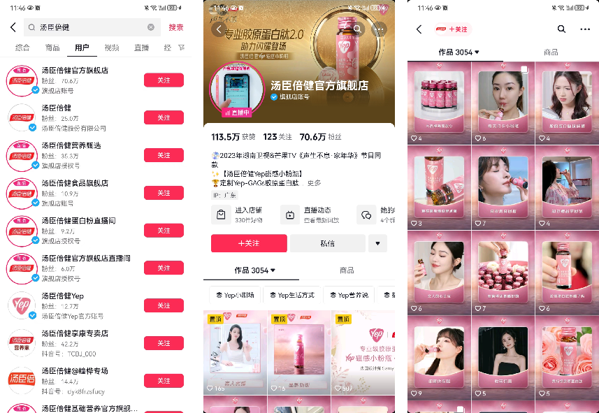汤臣倍健在抖音设置了矩阵,总共有200万+粉丝,其中主号汤臣倍健官方旗舰店有70.6w粉丝,获赞113.5w。帐号内容以产品推广、活动宣传、直播推广为主。