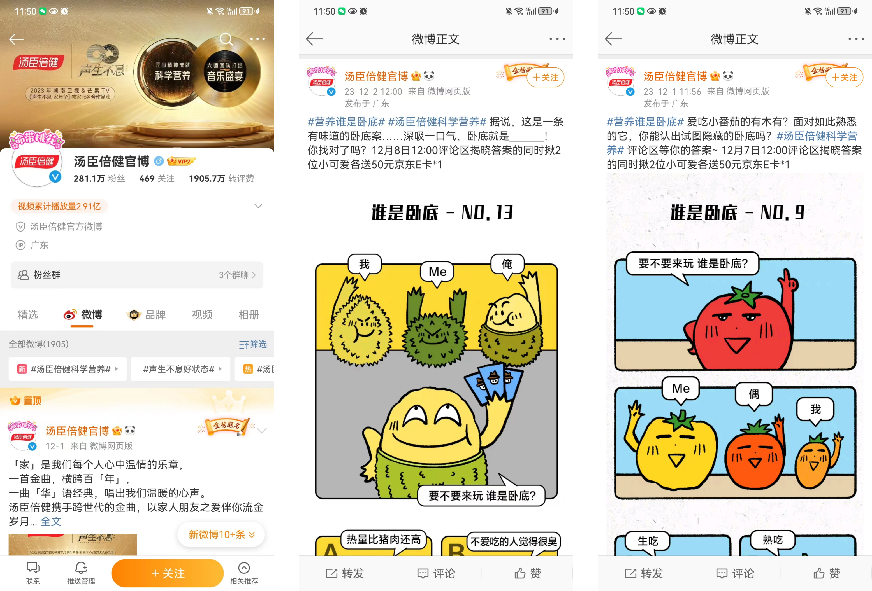 汤臣倍健在微博有281.1w粉丝,转赞评1905.7w。微博会分享有奖互动、活动宣传、产品介绍等内容。
