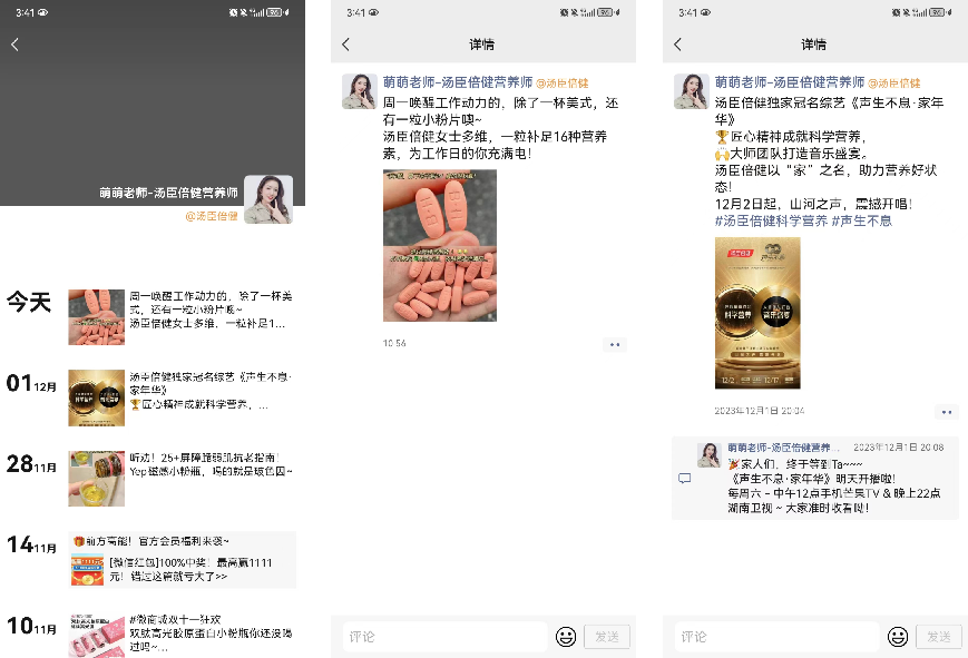 相较于微博、小红书,汤臣倍健在公众号的营销活动更为频繁。