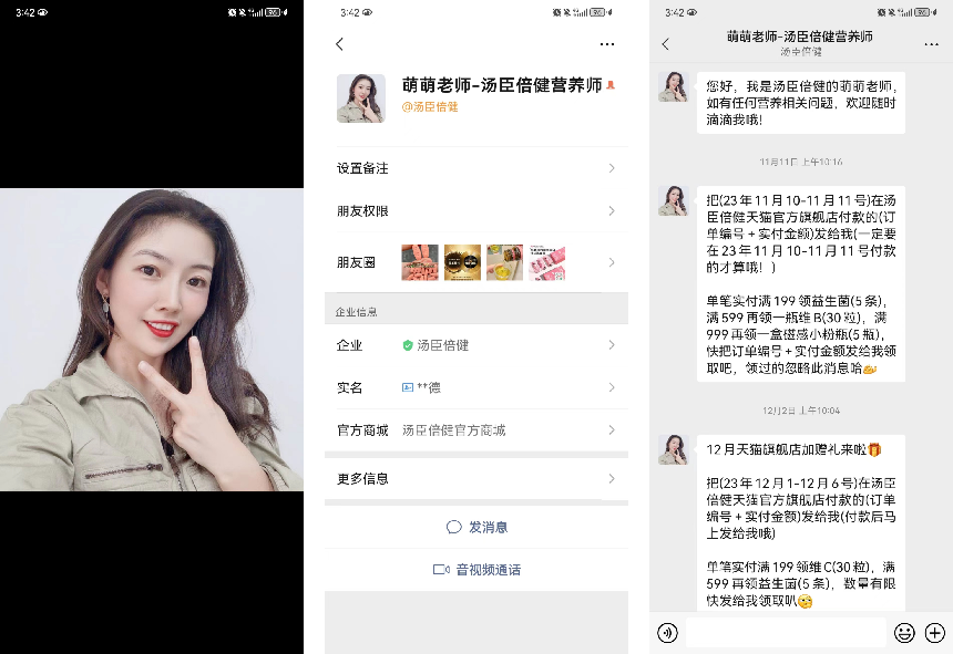 在每个企微名片里,都能看到汤臣倍健的「官方商城」的链接,其中,点击「官方商城」能跳转到小程序的点单页面。