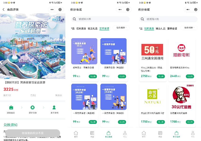 在汤臣倍健的【商城】,我们看到积分可以兑换多种好物。既有蛋白粉、绯常磁感等产品。有肯德基、奈雪、猫眼等代金券,此外还能兑换营养食谱、预约检测等等。