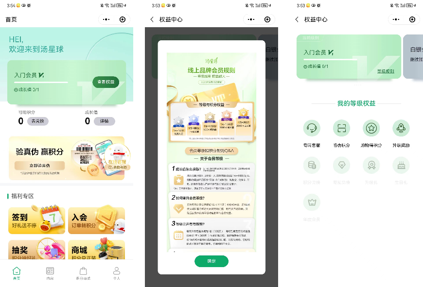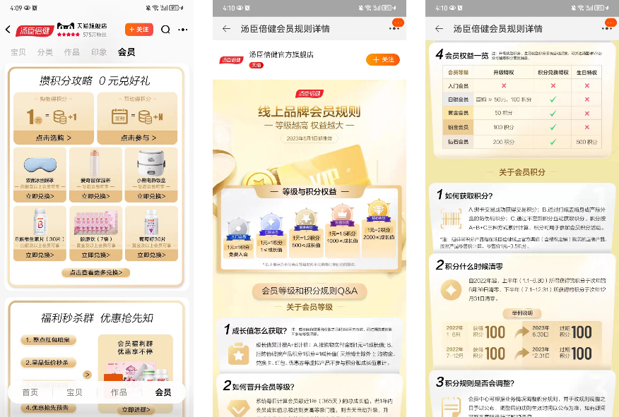汤臣倍健在小程序和电商平台都建立了相应的会员体系,都以成长型会员+积分体系为主。