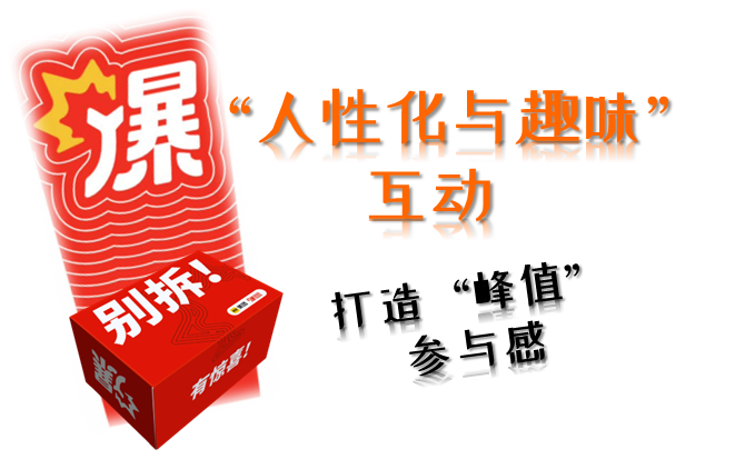 快闪秀以鲜明红搭配缤纷色彩塑造可感知的爆款视觉符号。巨型的爆团团气球、PLUS版的爆团团显眼包,随机“掉落”的惊喜盲盒,以及美中有品的各式“爆”字系列视觉化物料,既适配TA们的审美,也将现场表现的灵活又富有张力,整个场域即是一张大型“邀请函”,让人流自然聚集。