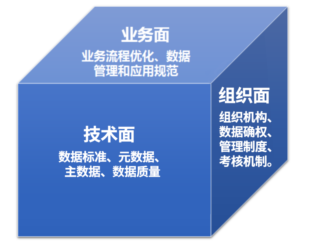 业务方面:数据治理应以业务需求为导向,解决管理层和业务部门的数据问题、痛点以及用数需求。在数据治理过程中,业务部门既是数据的生产方,也是数据的使用方,因此围绕数据治理建立和优化“业务协同”的数据治理流程和规范体系,对数据治理至关重要。