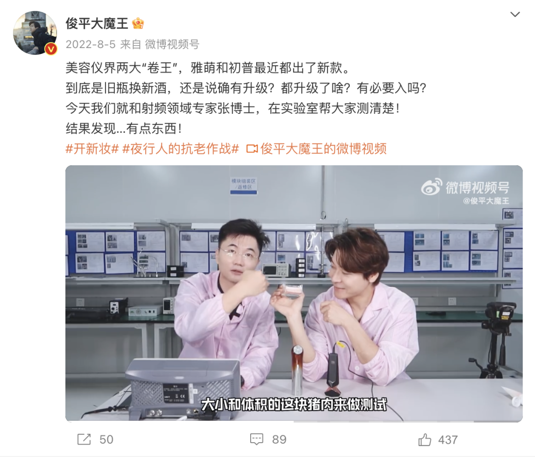 护肤达人“俊平大魔王”在实验室用猪肉测试美容仪效果