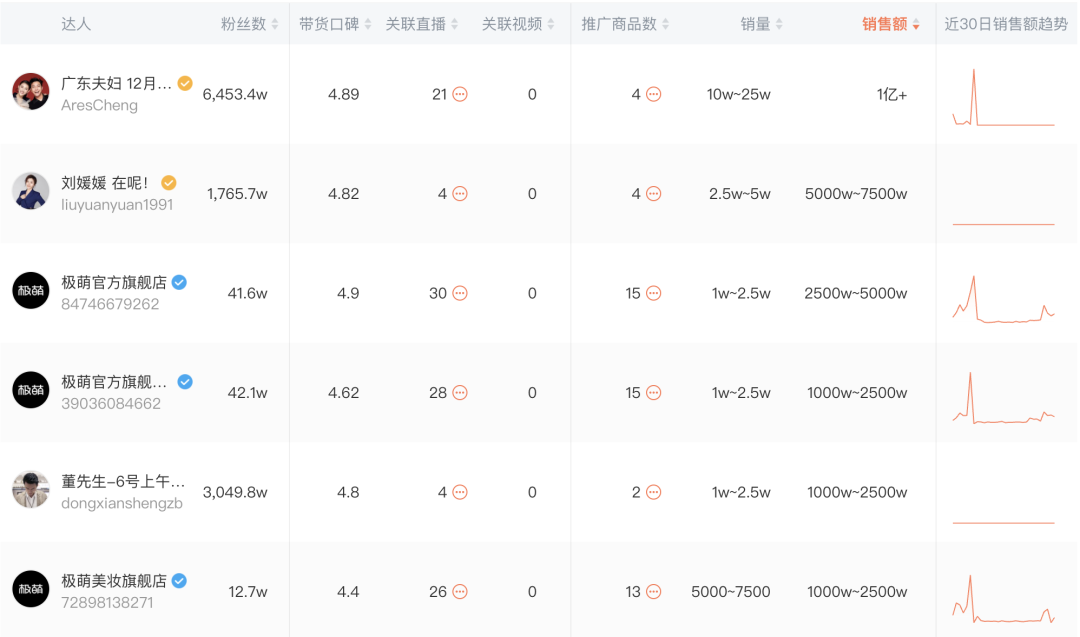 而在直播卖货方面,极萌打造了一个相当立体化的带货矩阵,涵盖了头部主播、大量腰部达人与尾部达人,达播与自播基本为 6:4。据蝉妈妈数据,在抖音平台,极萌近一个月的直播关联达人就有 200+,其活跃程度虽不及头部美妆品牌,但也远高于竞品觅光和雅萌。最典型的合作头播包括广东夫妇、交个朋友、董先生等人。其中光是广东夫妇的双11 直播间,就贡献了上亿销售:10 月 20 日直播销售额超过 7000 万元;11 月 3 日又贡献超 3800 万元。
