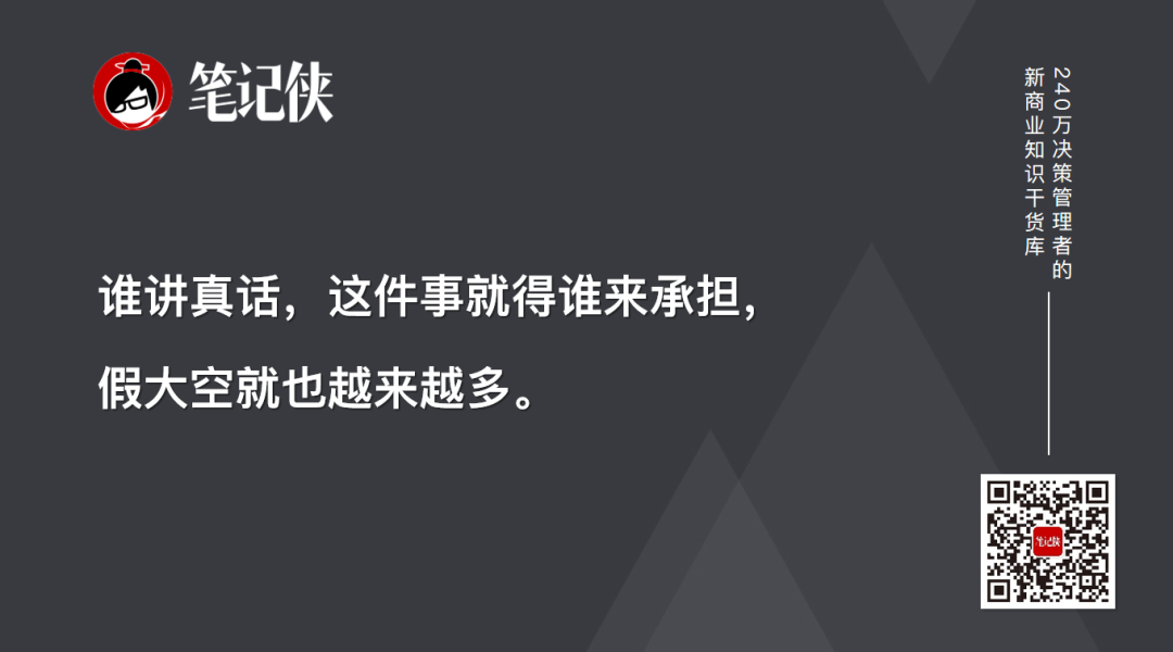 他知道讲真话的风险极高,因为讲真话既会得罪领导,也会得罪周边同事。最关键的是:谁讲真话,这件事就得谁来承担,因此不提问题最好,提了,这个问题的责任就落在了他的身上,假大空就也越来越多。