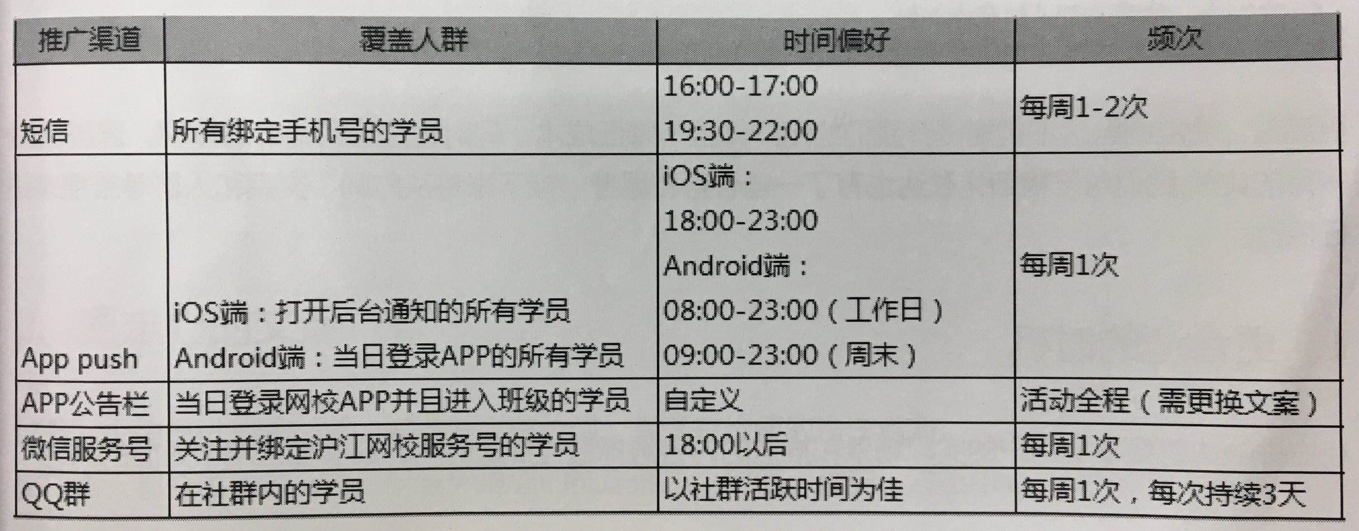 触达渠道分为主动触达渠道和被动触达渠道,即推送渠道和推广位。我们目前已有的渠道有很多,其中最常使用的是短信、微信服务号、APP push、QQ群和班级公告栏。