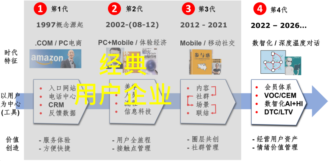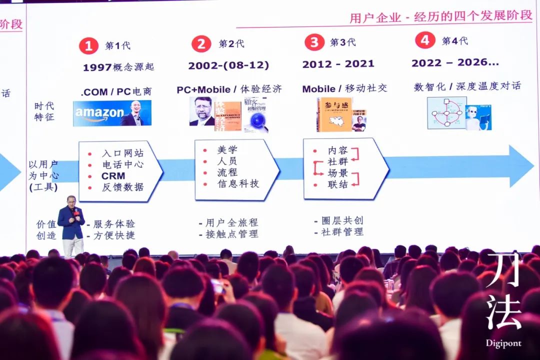 用几句话来总结用户企业发展的四个阶段:第一个阶段是服务体验,第二是用户全旅程,第三是圈层用户共创,最后一个是深度对话共创。