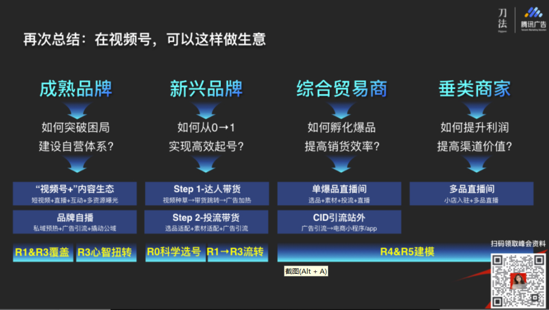 同时,他将视频号上的品牌商家分为成熟品牌、新兴品牌、综合类贸易商、垂类商家四种类型,让大家可以对号入座,找到最适合自己的打法。
