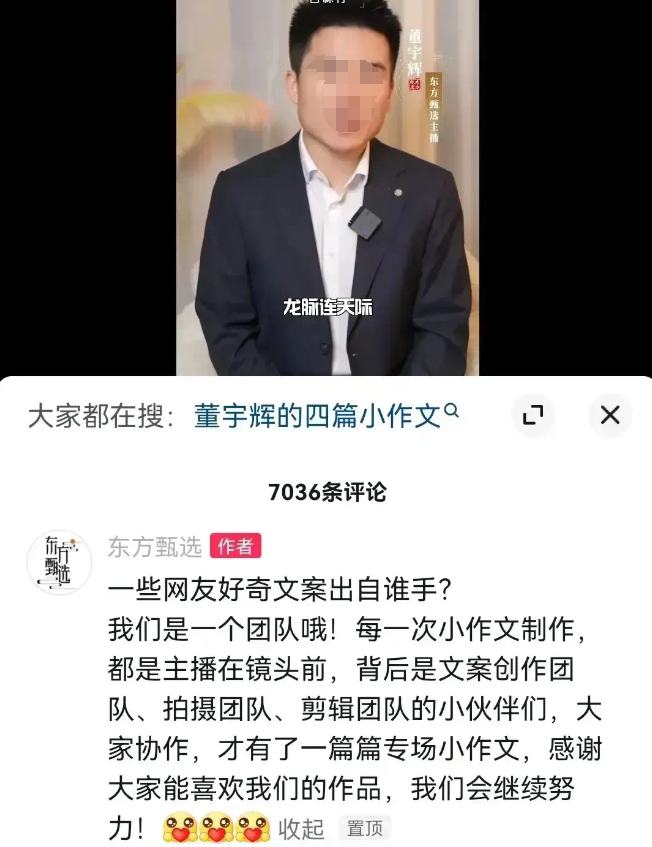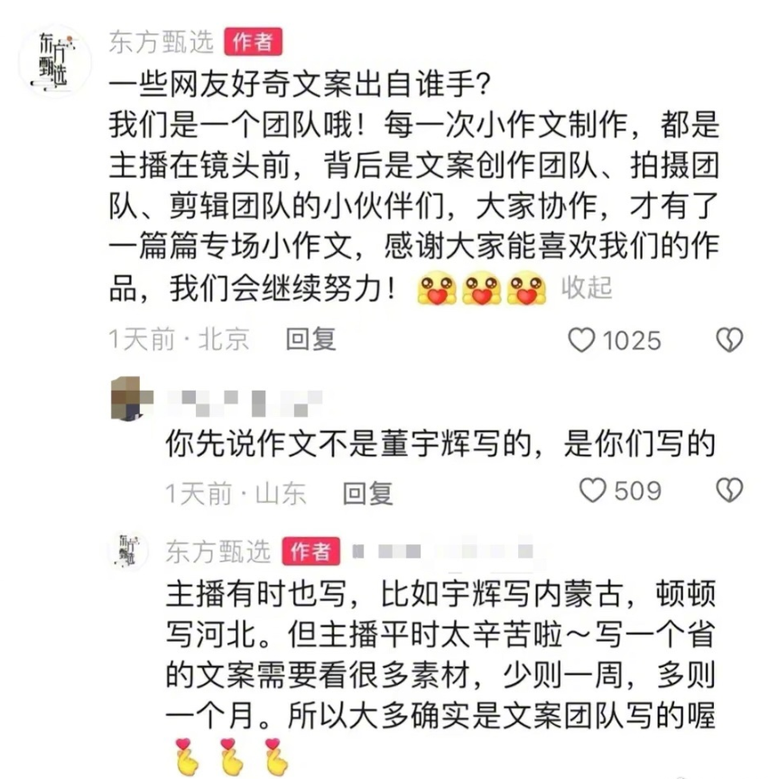 负责管理东方甄选账号的小编回复粉丝称:“我们是一个团队哦!每一次小作文制作,都是主播在镜头前,背后是文案创作团队、拍摄团队、剪辑团队的小伙伴们”。
