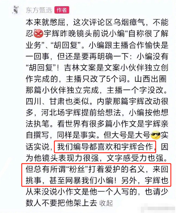 不过在最后,小编也依旧在强调,董宇辉从未称小作文都是他写的,小编们也喜欢和董宇辉合作,只是总有所谓“粉丝”打着爱护的名义挑事,甚至网暴小编。