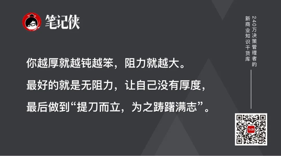 我们今天,其实也是在没缝隙的地方找缝隙,你越厚就越钝越笨,阻力就越大。最好的就是无阻力,让自己没有厚度,最后做到“提刀而立,为之踌躇满志”。