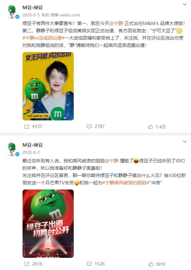 同样是顺势而为,在网友无意间发现M&M S绿豆和宁静撞脸,眼神、笑容都非常神似后,纷纷手动艾特品牌与宁静,并得到了正主的回应。于是,品牌顺势聘请宁静为M&M S豆的品牌大使,组成美飒女团正式出道而火遍了网络。这波“归顺民意”的代言也迅速提升了品牌在消费者心中的好感度和知名度。随后,M&M S绿豆上线了一大批与宁静有关的传播素材,都得到了超高的传播与关注,传播效应明显。