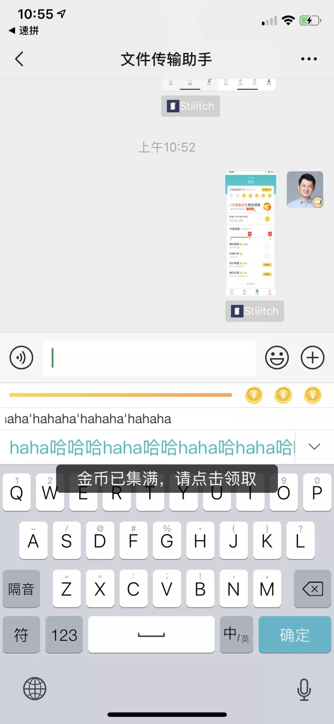 在你输入文字的时候,进度条会噗嗤噗嗤的往前冲,每攒满一个进度条,就获得了一个金袋,最多可积累三个。三个都满了就会提示你赶紧收吧,没法再积累了。。。