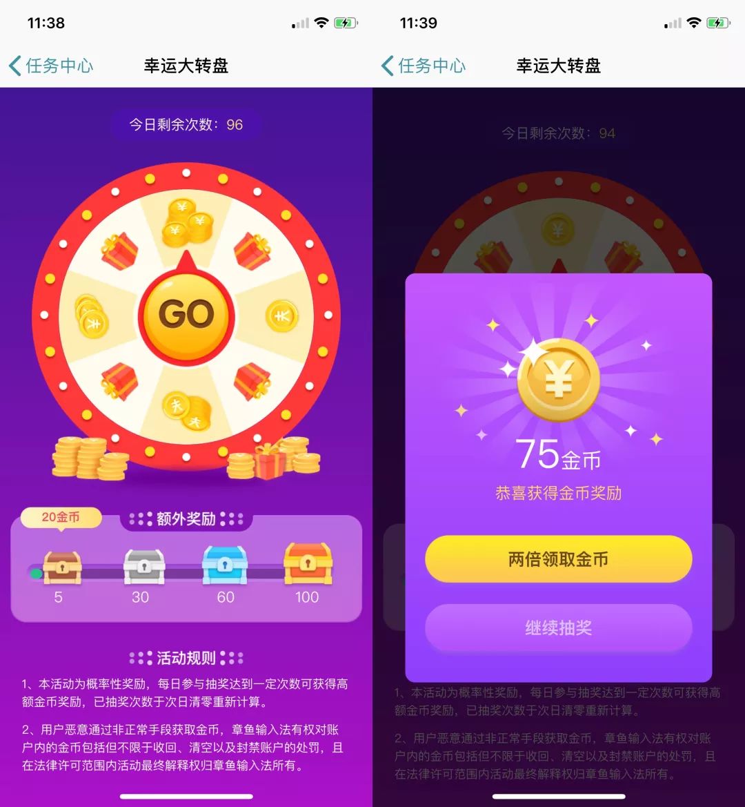4.每日任务:打满100字、玩大转盘、签到任务、每日分享