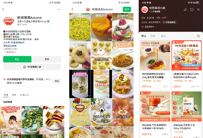 视频号【秋田满满Autumn】,主要以品牌宣传、宝宝辅食等内容,首页设置企业微信引流的触点,用户点击即可跳转进入私域。