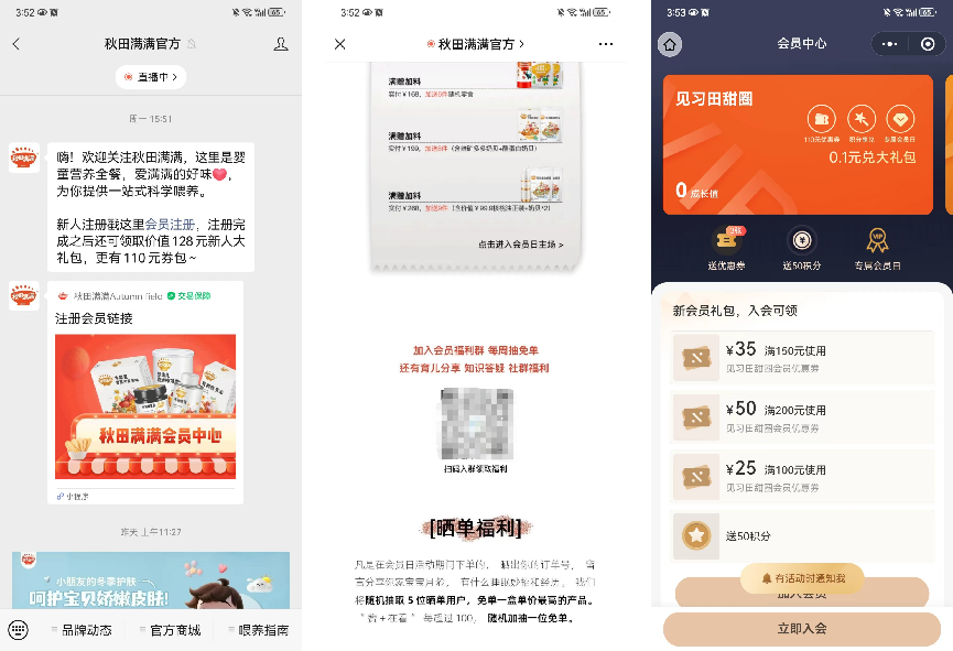 关注「秋田满满官方」公众号后,欢迎语中介绍品牌特性,福利活动并附带跳转链接。用户点击链接后,可注册成为品牌会员。