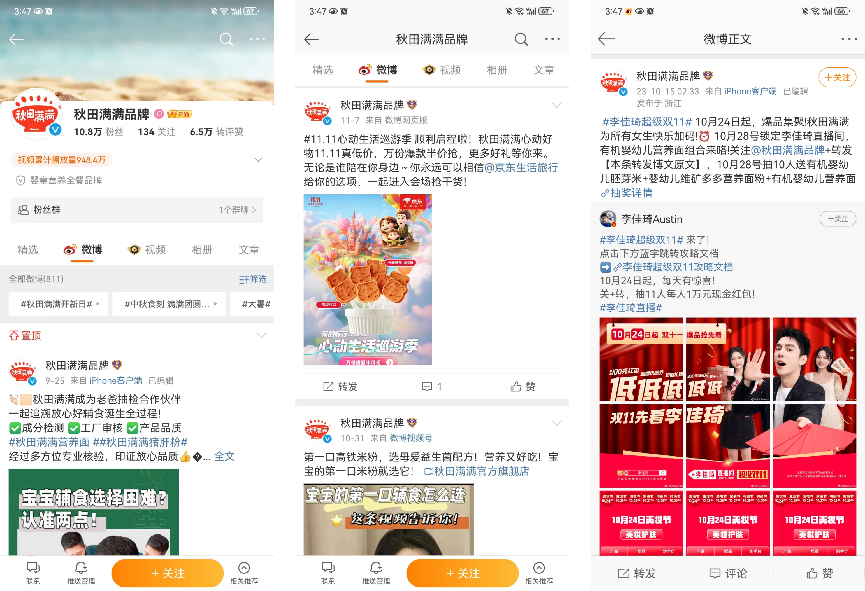 秋田满满在微博有10.8w粉丝,转赞评6.5w。微博会分享有奖互动、活动宣传、产品介绍等内容。