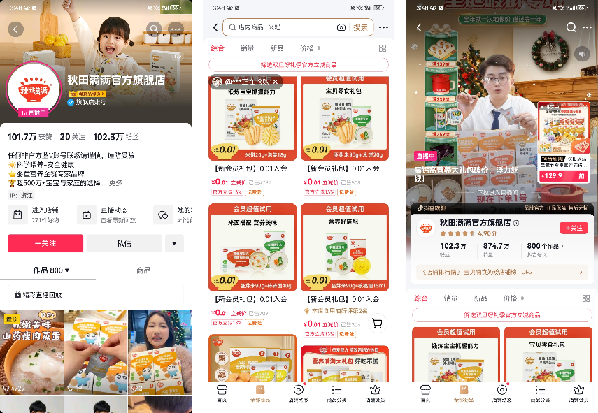 秋田满满在抖音有102.3w粉丝,获赞874.7w。账号内容以产品介绍、活动宣传、直播推广为主。