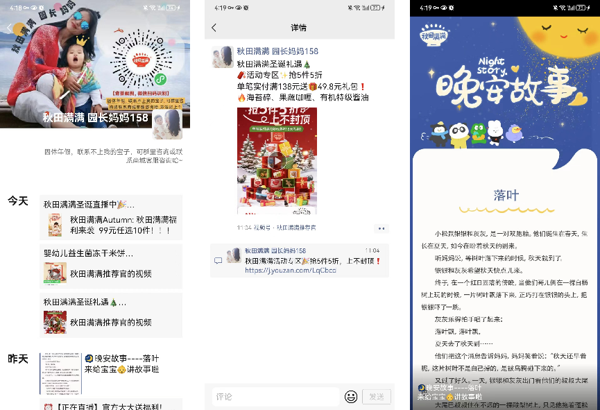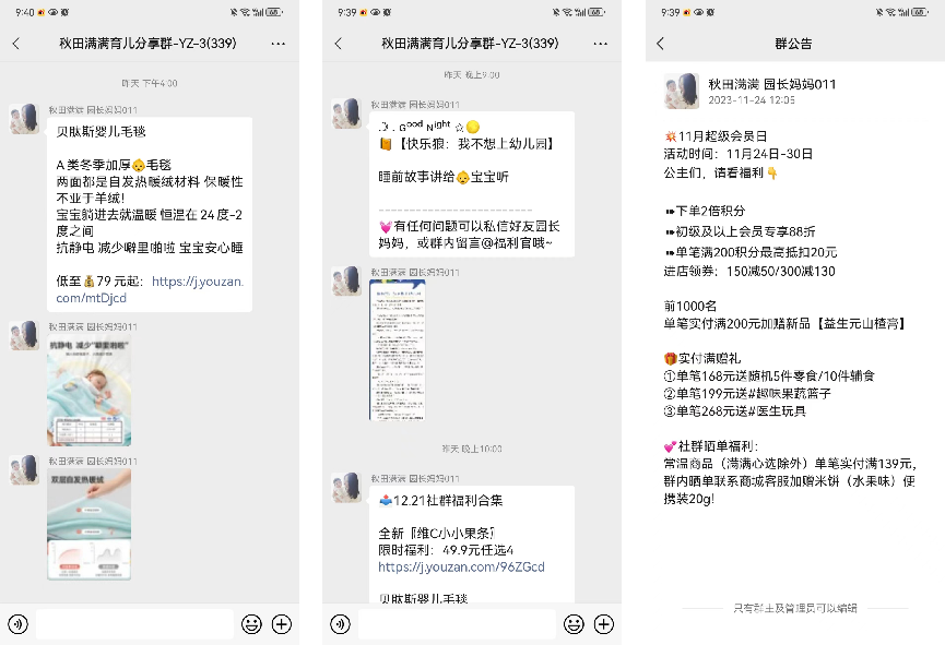 秋田满满的主要侧重于活动的宣传,吸引用户产生消费。社群内容较为丰富,一天多个时段推送用户。既有产品福利,育儿知识,也有晚安故事。