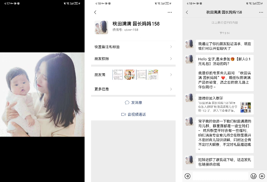 2)朋友圈精细化运营:秋田满满的园长妈妈每天会发8条朋友圈,内容覆盖育儿贴士、辅食食谱、晚安故事等多个栏目。通过解决宝妈群体日常素材需求,可以加强信任感,快速拉近与用户的距离。