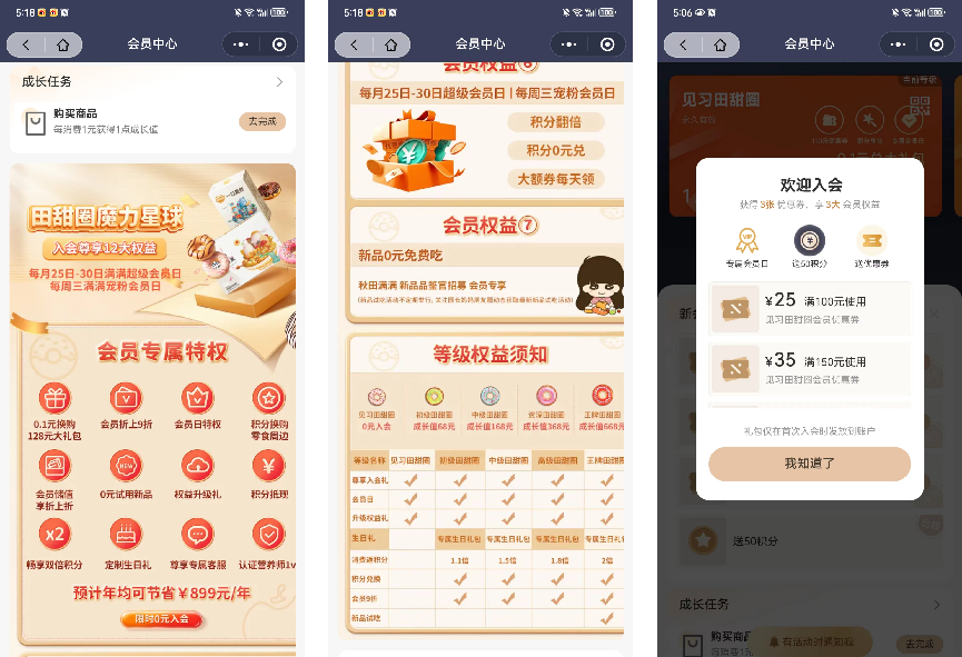 秋田满满建立了完善的成长会员体系,将会员分为了5个等级:见习田甜圈、初级田甜圈、中级田甜圈、高级田甜圈、王牌田甜圈,等级越高享受的权益自然也越高。