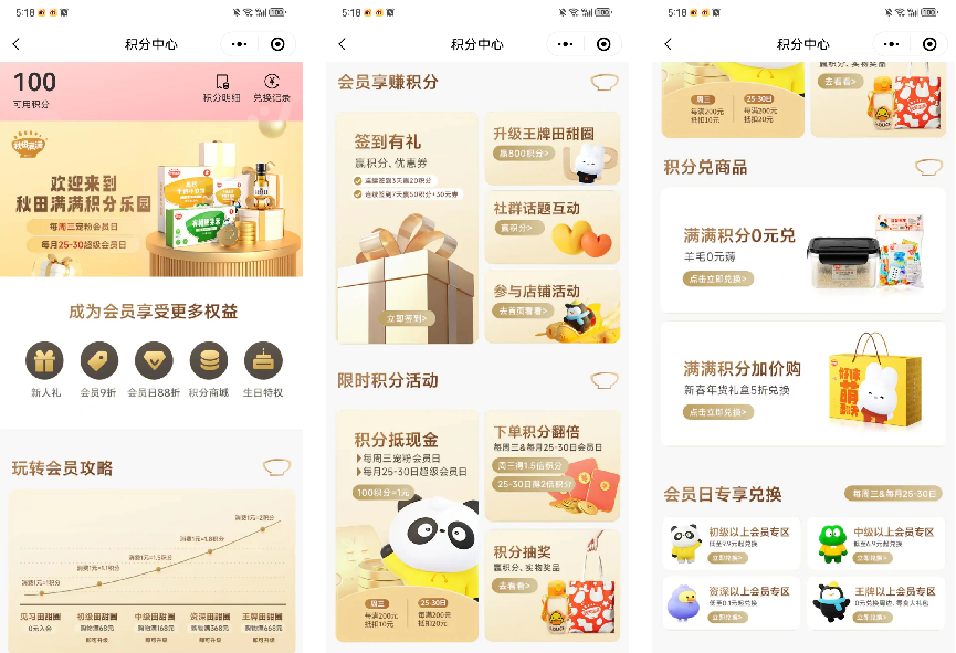 其中每消费1元可获得100积分,积分可用于兑换产品。此外,秋田满满还支持积分抽奖。在指定会员日下单积分翻倍。