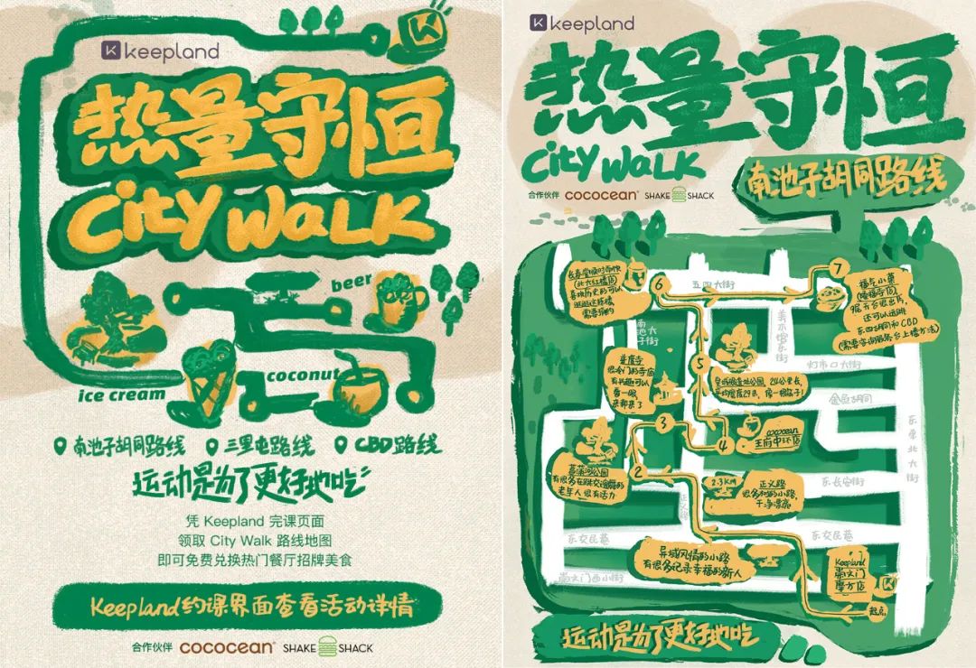 如在 Keep运动APP今年就以Keepland为起点,利用北京市的热门路线,发起了一场「热量守恒 Citywalk」活动,提出了“运动是为了更好地吃”的口号,有效链接了餐饮、运动鞋服等多个门店,将年轻人需求的情怀和运动、线下门店与Keep为代表的品牌等多个元素联系到一起,让目标受众在City Walk的过程中0距离接触到产品,在实现了品牌与受众的顺畅沟通,帮助品牌实现了有效的营销转化。