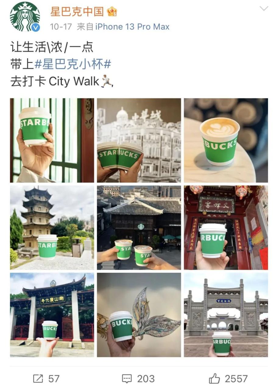 如制造了第三空间概念的星巴克,在面对City Walk热点时,就呼吁更多消费者一起去City Walk,并拍照发到社交网络,而放大了City Walk的社交效果,也让喝星巴克不仅在第三空间,可以在城市的各个角落,给了消费者更休闲更惬意的情绪价值,也拓宽了产品的体验场景。