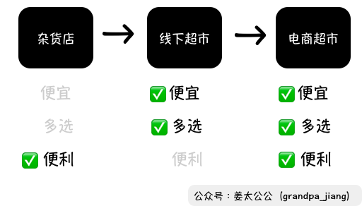 而上面说的用户需求,本质上都是用户为了减少购买所需要的成本。比如便利是减少购买的时间成本,便宜是减少购买的金钱成本,多选是减少购买的选择成本。