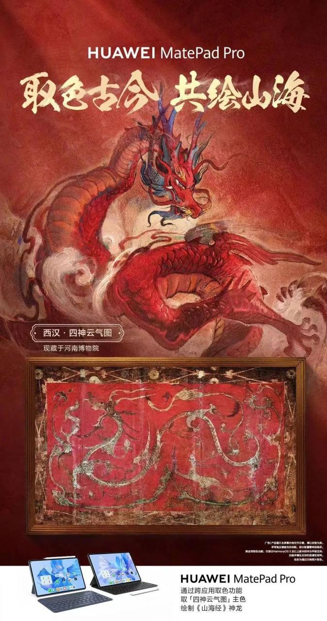 比如华为和河南博物院合作,以「四神云气图」为灵感,借助自家产品的“取色”功能绘制出《山海经》中的神龙,让大家对神兽多了具象形象的感知。