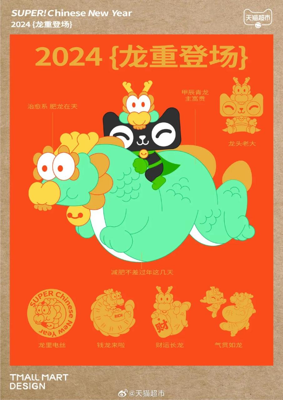 天猫超市最近预告的新IP「小铛家」,形象就是一条笨笨的大肥龙,呼应「“龙”重出场」的玩梗。