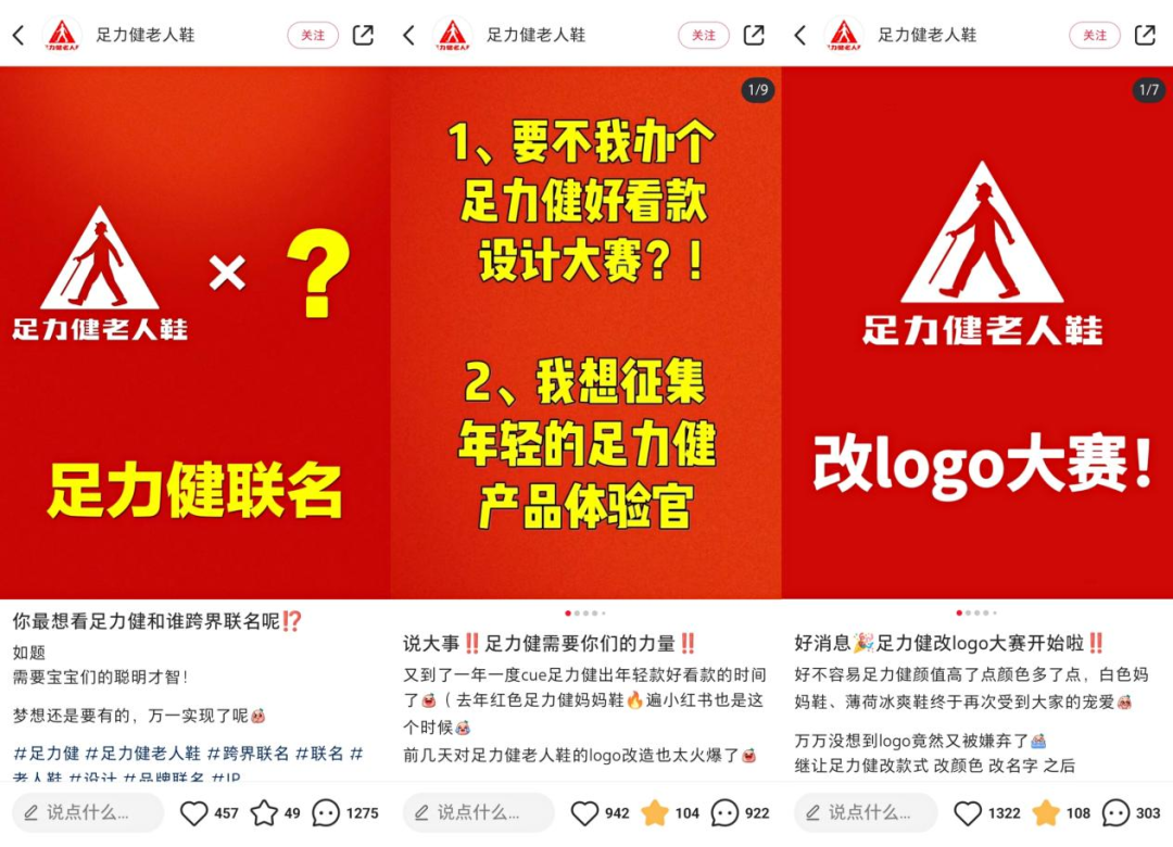 足力健在小红书上的运营方式多样,不仅在各种改造帖下积极互动,还专门汇总各种改造贴进行分享,同各种国货品牌展开互动,开启改logo大赛、设计大赛、招募产品体验官等多种运营活动,活跃得不像个“老人鞋”品牌,至今在小红书上吸引了2.9W粉丝,建立3个品牌私域群组。