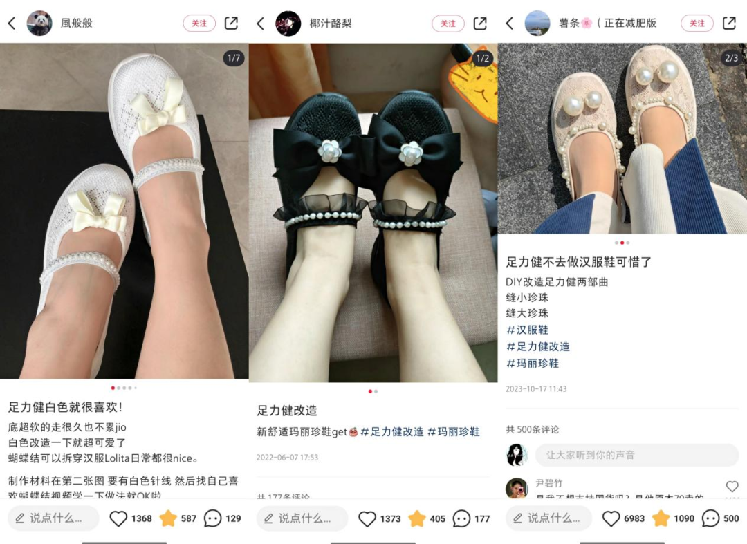 去年4月开始,Lolita和汉服爱好者在小红书上传足力健改造教程,白色足力健被改为精致的蕾丝鞋,自此开始流行足力健的低价改造教程。