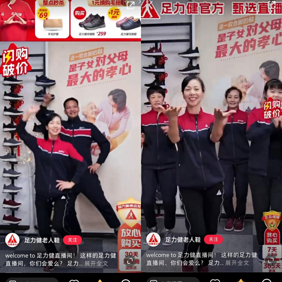 22年11月,足力健将广场舞模特队的阿姨们请到直播间,开启一场别开生面的“广场舞”式直播。